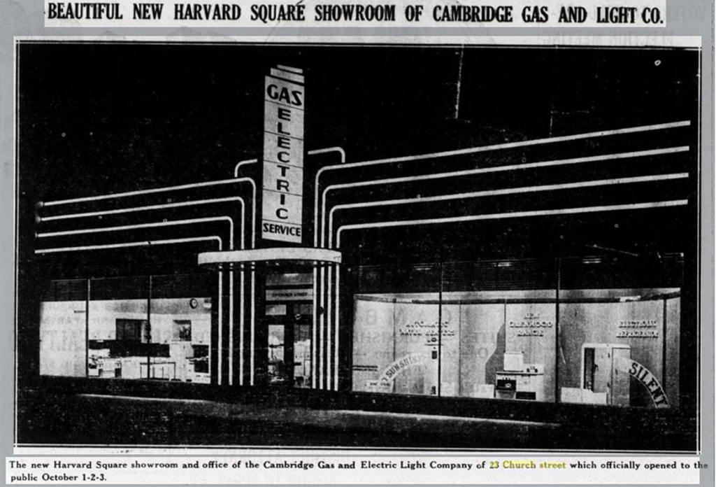 The first structure at the site was a blacksmith shop in the late 1800s, later a veterinary practice. That became mixed retail at the turn of the century as Harvard Square became more thickly settled and the subway arrived in 1912, said Cambridge Historical Commission executive director Charles Sullivan. The 23 Church St. structure was razed in favor of the current one-story 1936 art deco design by architect William Laurence Galvin as a new, upscale home for Cambridge Gas and Electric Light Co.