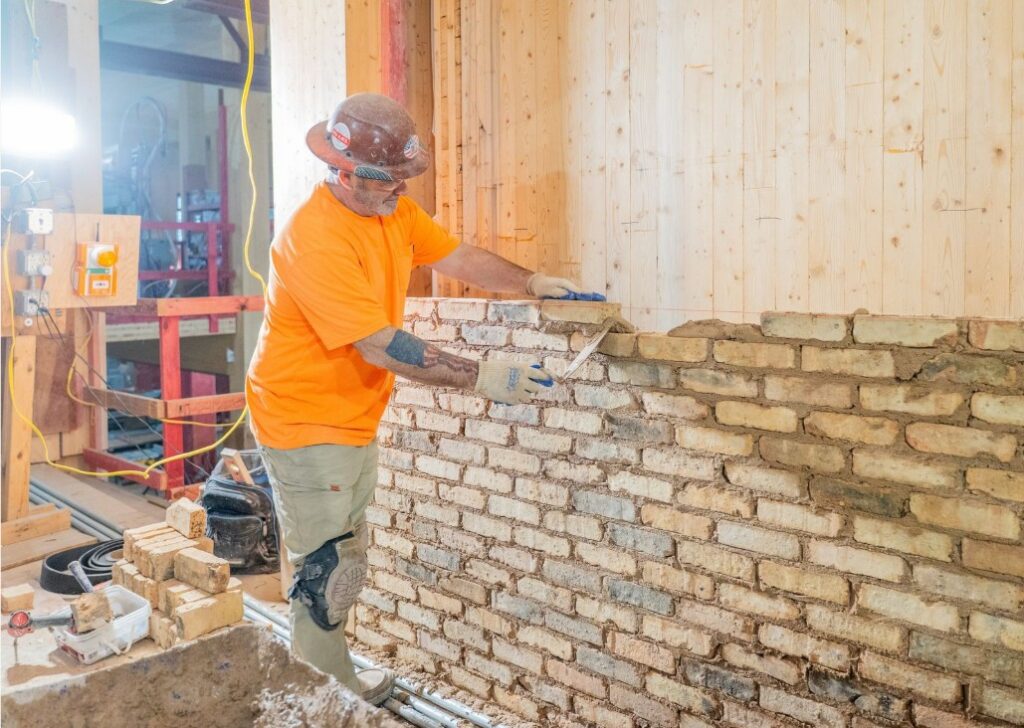 Reclaimed brick is a cornerstone of the Goel Center’s regenerative design framework to shift from simply minimizing damage to actively doing good by giving more back to its community, ecosystem, and occupants than it takes across its lifespan. Approximately 190 tons of light-colored Chicago Common Brick was reclaimed for the Goel Center’s construction to support the project’s aim to lower its overall embodied carbon impact.