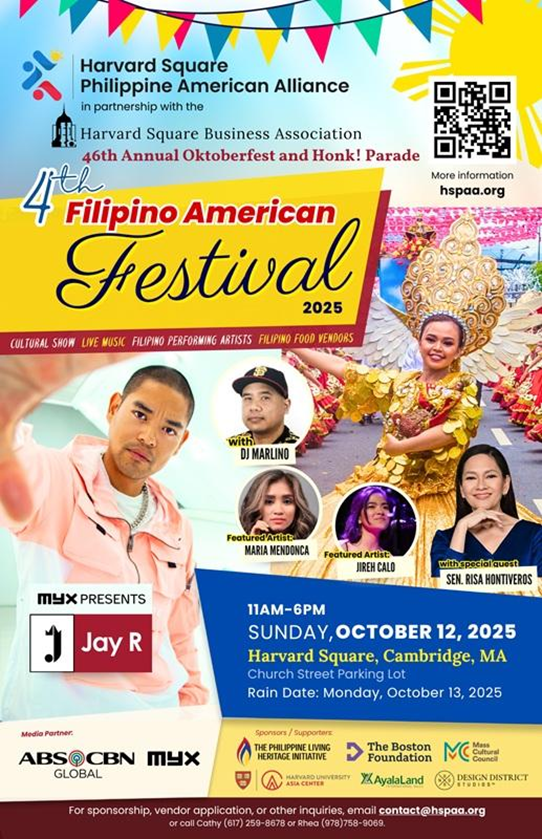 The Harvard Square Philippine American Alliance (HSPAA) is thrilled to present the 4th Annual Filipino American Festival. This FREE celebration of Philippine History Month is bursting with flavor, rhythm, and community joy—and everyone’s invited! Whether you’re Filipino or just Filipino-at-heart, this is your chance to experience the warmth, flavor, and fun of the Philippines—right in Cambridge. Come hungry, come curious, and come ready to celebrate!